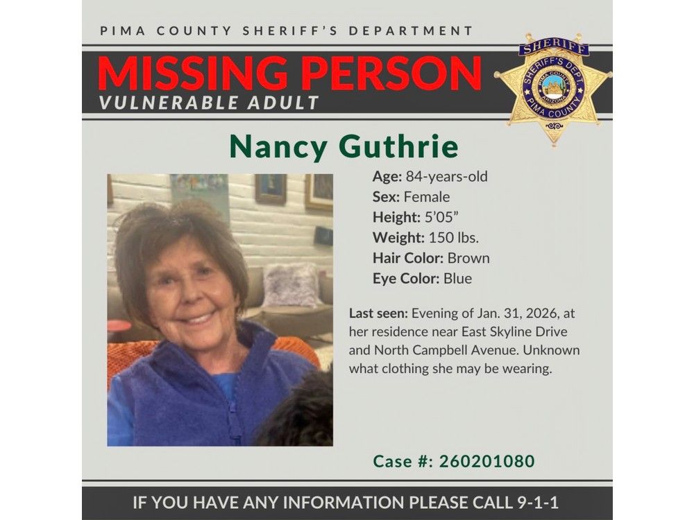 This image provided by the Pima County Sheriff’s Department on Feb. 2, 2026, shows a missing person alert for Nancy Guthrie. Photo by Uncredited /AP