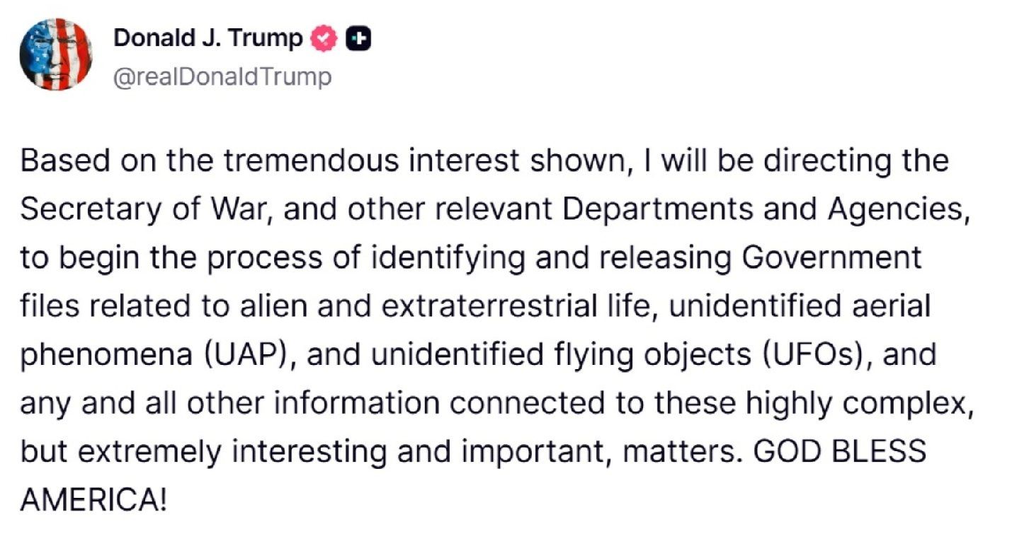 The president later posted on social media that he was directing the Department of War and “other relevant departments and agencies” to release files related to aliens, extraterrestrial life, unidentified aerial phenomena and UFOs, calling them “highly complex, but extremely interesting and important matters.”
